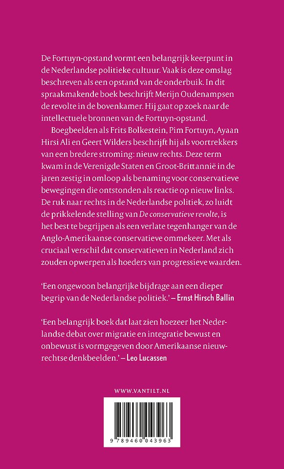 Boegbeelden als Frits Bolkestein, Pim Fortuyn, Ayaan Hirsi Ali en Geert Wilders beschrijft hij als voortrekkers van een bredere stroming: nieuwrechts. Deze term kwam in de Verenigde Staten en Groot-Brittannië in omloop als benaming voor conservatieve bewegingen die in de jaren zestig ontstonden als reactie op nieuw links. De politieke omslag in Nederland, zo luidt de prikkelende stelling van De conservatieve revolte, is een verlate tegenhanger van de Anglo-Amerikaanse conservatieve ommekeer.