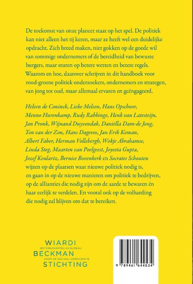 Heleen de Coninck, Lieke Melsen, Hans Opschoor, Menno Hurenkamp, Rudy Rabbinge, Henk van Latesteijn, Jan Pronk, Wijnand Duyvendak, Daniëlla Dam-de Jong, Ton van der Zon, Hans Dagevos, Jan Erik Keman, Albert Faber, Herman Vollebergh, Wokje Abrahamse, Linda Steg, Maarten van Poelgeest, Joyeeta Gupta, Jozef Keulartz, Bernice Bovenkerk en Socrates Schouten wijzen op de plaatsen waar nieuwe politiek nodig is, en gaan in op de nieuwe manieren om politiek te bedrijven, op de allianties die nodig zijn om de aarde te bewaren én haar eerlijk te verdelen. En vooral ook op de volharding die nodig zal blijven om dat te bereiken.