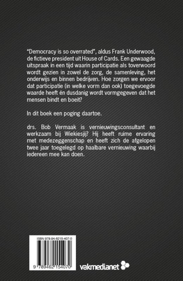 "Democracy is so overrated", aldus Frank Underwood, de fictieve president uit House of Cards. Een gewaagde uitspraak in een tijd waarin participaties als toverwoord wordt gezien in zowel de zorg, de samenleving, het onderwijs en binnen bedrijven. Hoe zorgen we ervoor dat participatie (in welke vorm dan ook) toegevoegde waarde heeft én dusdanig wordt vormgegeven dat het mensen boeit?