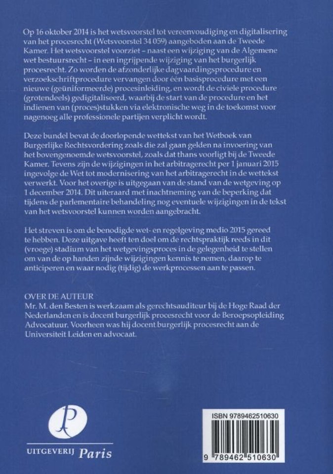 Deze bundel bevat de doorlopende wettekst van het Wetboek van Burgerlijke Rechtsvordering zoals die zal gaan gelden na invoering van het bovengenoemde wetsvoorstel, zoals dat thans voorligt bij de Tweede Kamer. Tevens zijn de wijzigingen in het arbitragerecht per 1 januari 2015 ingevolge de Wet tot modernisering van het arbitragerecht in de wettekst verwerkt. Voor het overige is uitgegaan van de stand van de wetgeving op 1 december 2014. Dit uiteraard met inachtneming van de beperking dat tijdens de parlementaire behandeling nog eventuele wijzigingen in de tekst van het wetsvoorstel kunnen worden aangebracht.