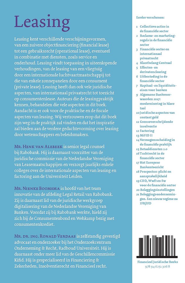 Aandacht is er ook voor de praktische en de fiscale aspecten van leasing. Wij vertrouwen erop dat dit boek zijn weg in de praktijk zal vinden en dat het inspiratie zal bieden aan de verdere gedachtevorming over leasing door wetenschappers en beleidsmakers.