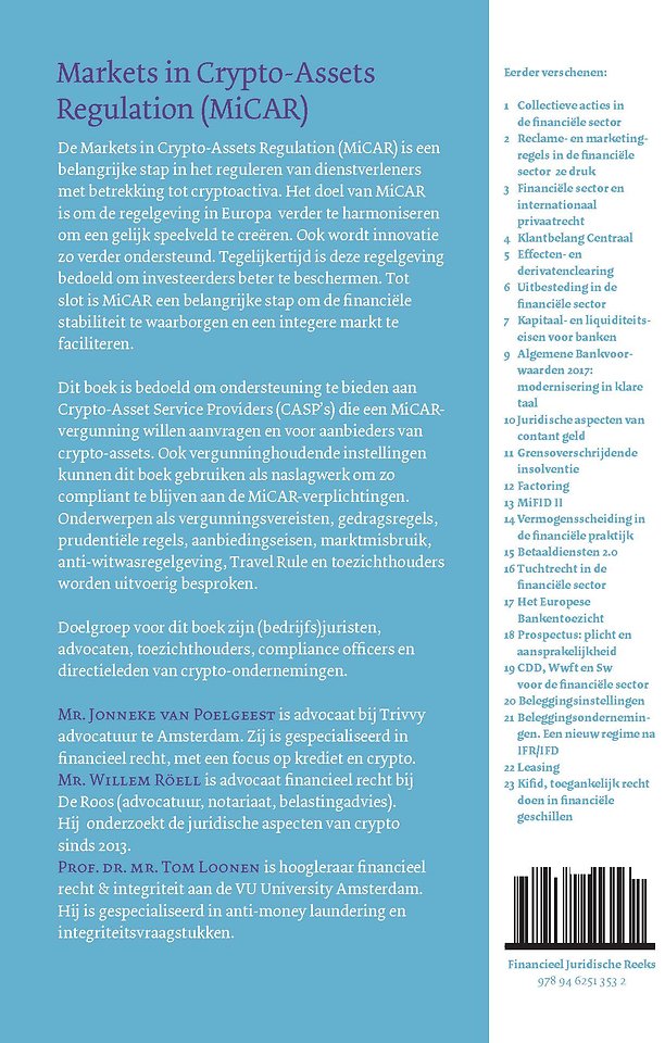 Dit boek is bedoeld om ondersteuning te bieden aan Crypto-Asset Service Providers (CASP’s) die een MiCAR-vergunning willen aanvragen en voor aanbieders van crypto-assets. Ook vergunninghoudende instellingen kunnen dit boek gebruiken als naslagwerk om zo compliant te blijven aan de MiCAR-verplichtingen. Onderwerpen als vergunningsvereisten, gedragsregels, prudentiële regels, aanbiedingseisen, marktmisbruik, anti-witwasregelgeving, Travel Rule en toezichthouders worden uitvoerig besproken