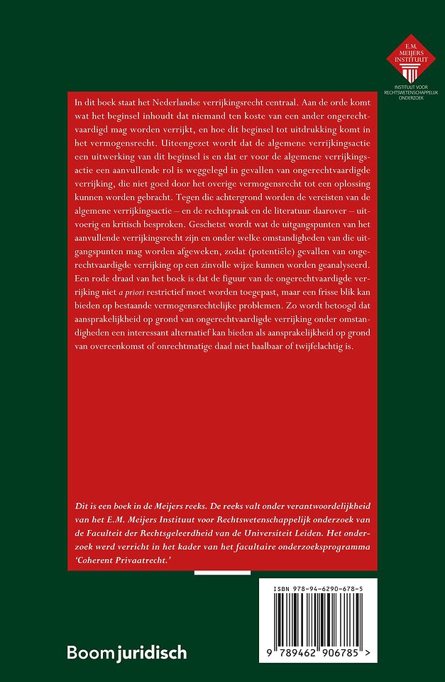 In dit boek staat het Nederlandse verrijkingsrecht centraal. Aan de orde komt wat het beginsel inhoudt dat niemand ten koste van een ander ongerechtvaardigd mag worden verrijkt, en hoe dit beginsel tot uitdrukking komt in het vermogensrecht. Uiteengezet wordt dat de algemene verrijkingsactie een uitwerking van dit beginsel is en dat er voor de algemene verrijkingsactie een aanvullende rol is weggelegd in gevallen van ongerechtvaardigde verrijking, die niet goed door het overige vermogensrecht tot een oplossing kunnen worden gebracht. Tegen die achtergrond worden de vereisten van de algemene verrijkingsactie – en de rechtspraak en de literatuur daarover – uitvoerig en kritisch besproken.