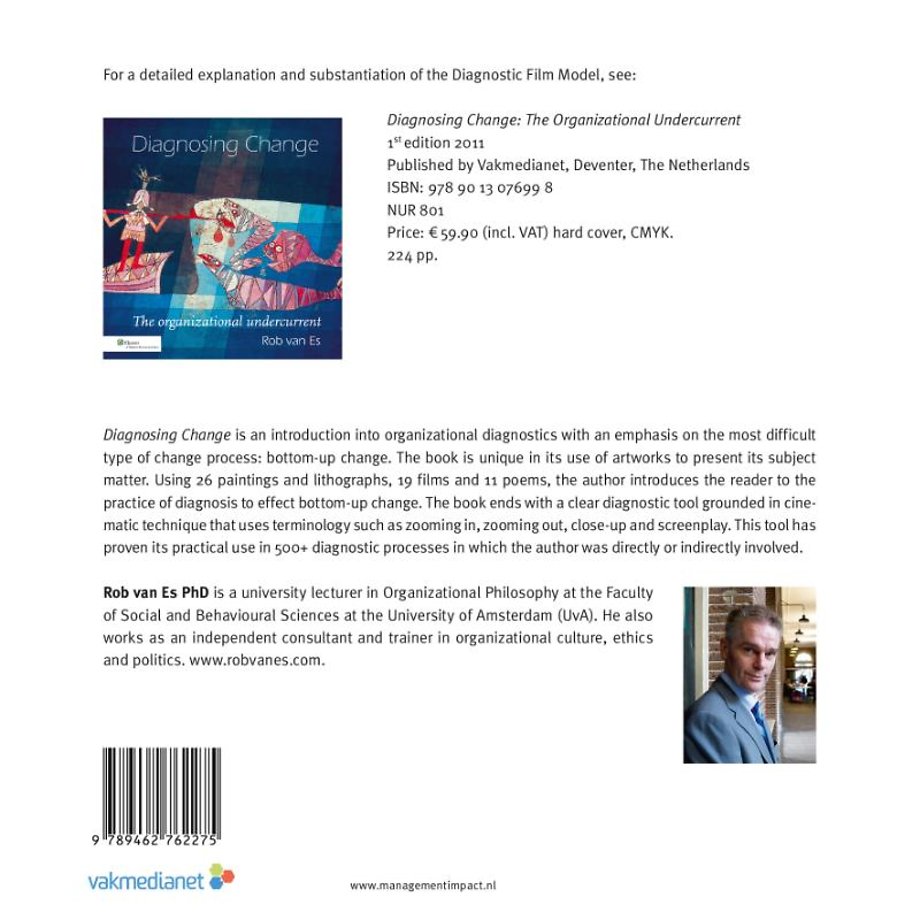 Using 26 paintings and lithographs, 19 films and 11 poems, the author introduces the reader to the practice of diagnosis to effect bottom-up change. The book ends with a clear diagnostic tool grounded in cinematic technique that uses terminology such as zooming in, zooming out, close-up and screenplay. This tool has proven its practical use in 500+ diagnostic processes in which the author was directly or indirectly involved.