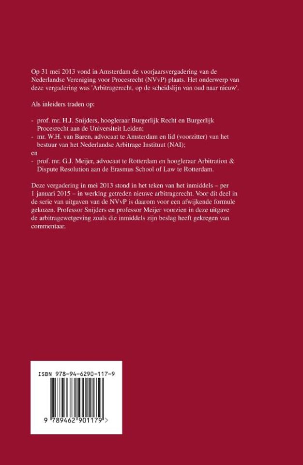 Deze vergadering in mei 2013 stond in het teken van het inmiddels – per 1 januari 2015 – in werking getreden nieuwe arbitragerecht. Voor dit deel in de serie van uitgaven van de NVvP is daarom voor een afwijkende formule gekozen. Professor Snijders en professor Meijer voorzien in deze uitgave de arbitragewetgeving zoals die inmiddels zijn beslag heeft gekregen van commentaar.