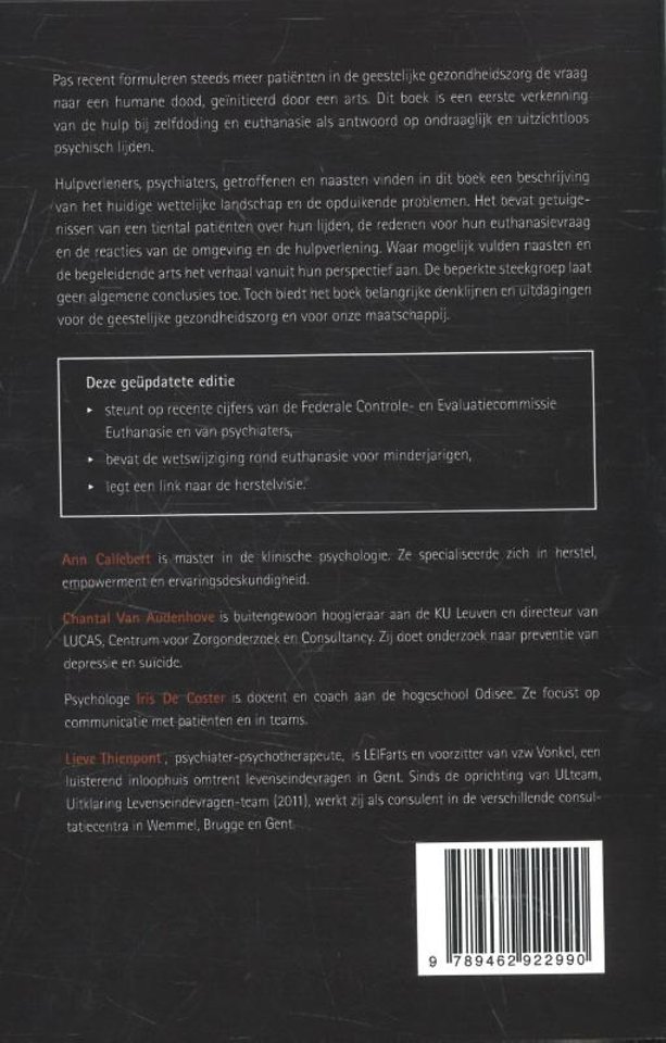 Hulpverleners, psychiaters, getroffenen en naasten vinden in dit boek een beschrijving van het huidige wettelijke landschap en de opduikende problemen. Het bevat getuigenissen van een tiental patiënten over hun lijden, de redenen voor hun euthanasievraag en de reacties van de omgeving en de hulpverlening. Waar mogelijk vulden naasten en de begeleidende arts het verhaal vanuit hun perspectief aan. De beperkte steekgroep laat geen algemene conclusies toe. Toch biedt het boek belangrijke denklijnen en uitdagingen voor de geestelijke gezondheidszorg en voor onze maatschappij.