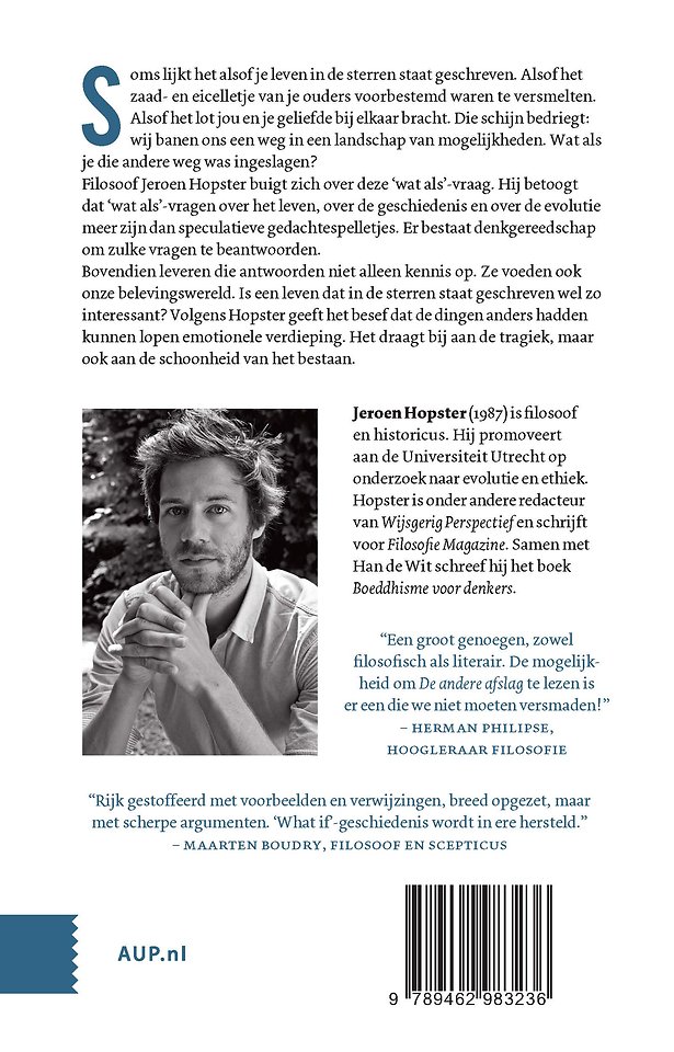Filosoof Jeroen Hopster buigt zich over deze 'wat als'-vraag. Hij betoogt dat 'wat als'-vragen over het leven, over de geschiedenis en over de evolutie meer zijn dan speculatieve gedachtespelletjes. Er bestaat denkgereedschap om zulke vragen te beantwoorden. Bovendien leveren die antwoorden niet alleen kennis op. Ze voeden ook onze belevingswereld.