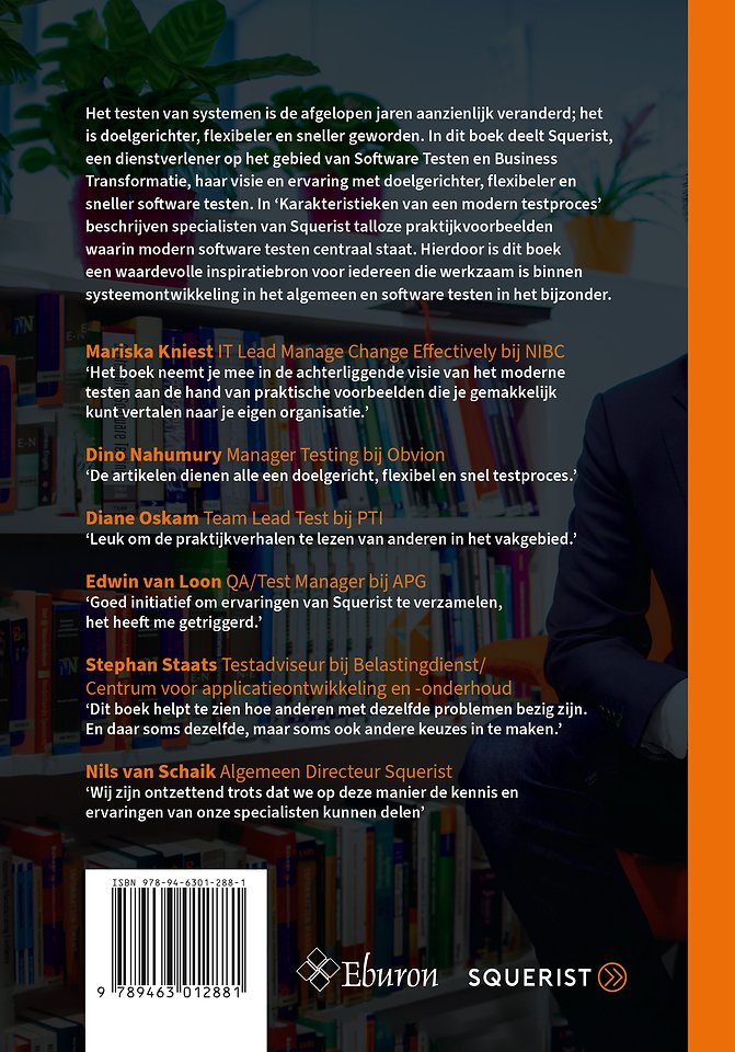 Het testen van systemen is de afgelopen jaren aanzienlijk veranderd; het is doelgerichter, flexibeler en sneller geworden. In dit boek deelt Squerist, een dienstverlener op het gebied van Software Testen en Business Transformatie, haar visie en ervaring met doelgerichter, flexibeler en sneller software testen. In ‘Karakteristieken van een modern testproces’ beschrijven specialisten van Squerist talloze praktijkvoorbeelden waarin modern software testen centraal staat. Hierdoor is dit boek een waardevolle inspiratiebron voor iedereen die werkzaam is binnen systeemontwikkeling in het algemeen en software testen in het bijzonder.