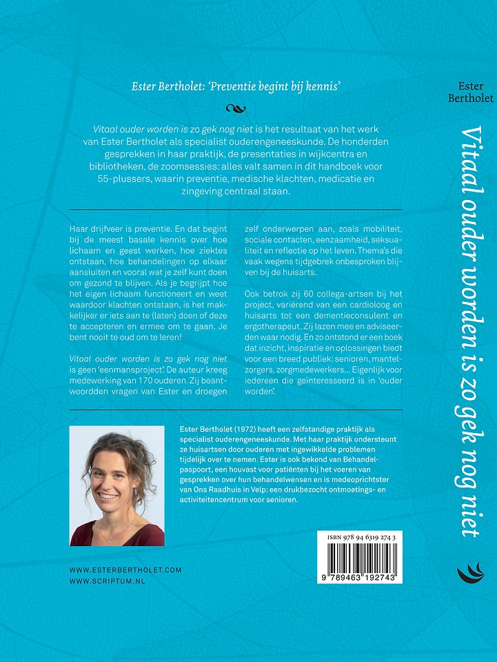 'Vitaal ouder worden is zo gek nog niet' is het resultaat van het werk van Ester Bertholet als specialist ouderengeneeskunde. De honderden gesprekken in haar praktijk, de presentaties in wijkcentra en bibliotheken, de zoomsessies: alles valt samen in dit handboek voor 55-plussers, waarin preventie, medische klachten, medicatie en zingeving centraal staan.