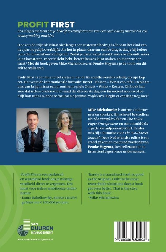 ‘Profit First’ is een cash management systeem dat de financiële wereld volledig op zijn kop zet. Het veegt de internationale formule Omzet – Kosten = Winst van tafel. In plaats daarvan krijgt winst een prominente plek: Omzet – Winst = Kosten. Dit boek laat zien dat iedere ondernemer vanaf de allereerste dag een financieel succesvol bedrijf kan runnen, door te focussen op winst. Profit First. Begin er vandaag nog mee!