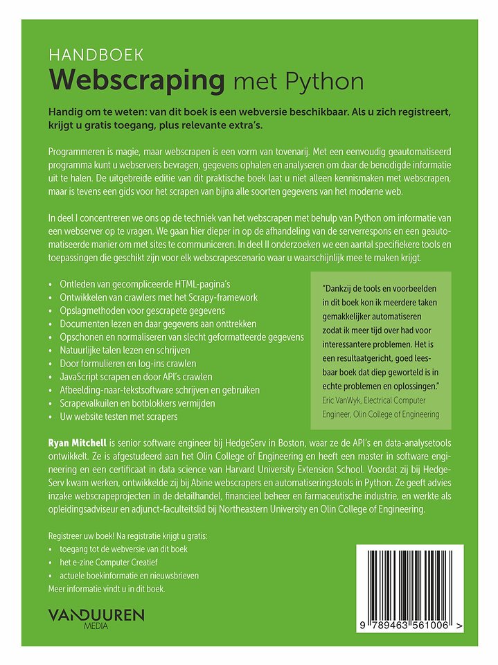 Programmeren is magie, maar webscrapen is een vorm van tovenarij. Met een eenvoudig geautomatiseerd programma kunt u webservers bevragen, gegevens ophalen en analyseren om daar de benodigde informatie uit te halen. De uitgebreide editie van dit praktische boek laat u niet alleen kennismaken met webscrapen, maar is tevens een gids voor het scrapen van bijna alle soorten gegevens van het moderne web.