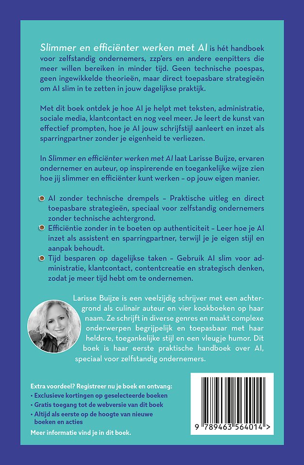 In Slimmer en efficiënter werken met AI laat Larisse Buijze, ervaren ondernemer en auteur, op inspirerende en toegankelijke wijze zien hoe jij slimmer en efficiënter kunt werken – op jouw eigen manier.