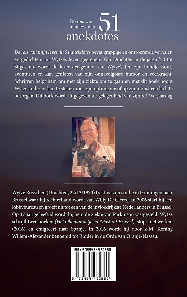 De Reis van mijn leven in 51 anekdotes bevat grappige en ontroerende verhalen en gedichten, uit Wytze’s leven gegrepen. Van Drachten in de jaren ’70 tot Sitges nu, wordt de lezer deelgenoot van Wytze’s (en van zijn hondje Boni) avonturen en kan genieten van zijn onnavolgbare humor en veerkracht. Schrijven helpt hem om met zijn ziekte om te gaan en met dit boek hoopt Wytze anderen ‘aan te steken’ met zijn optimisme of op zijn minst een lach te bezorgen. Dit boek wordt uitgegeven ter gelegenheid van zijn 51ste verjaardag.