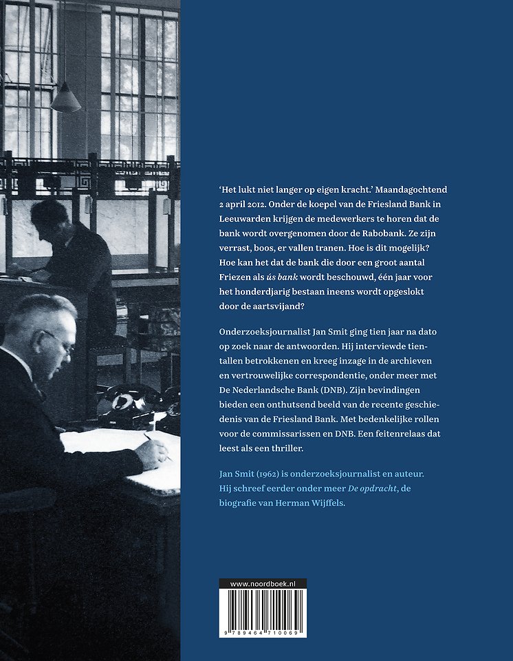 Onderzoeksjournalist Jan Smit ging tien jaar na dato op zoek naar de antwoorden. Hij interviewde tientallen betrokkenen en kreeg inzage in archieven en vertrouwelijke correspondentie, onder meer met De Nederlandsche Bank (DNB). Zijn bevindingen bieden een onthutsend beeld van de recente geschiedenis van de Friesland Bank. Met bedenkelijke rollen voor de commissarissen en de DNB. Een feitenrelaas dat leest als een thriller.