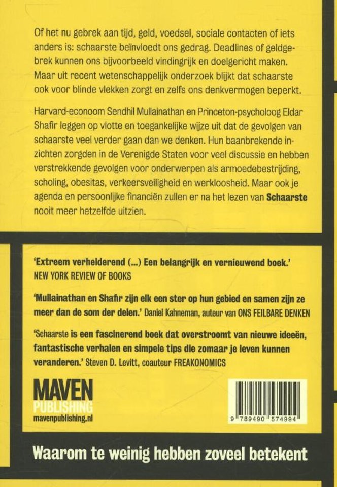 “Mullainathan en Shafir zijn elk een ster op hun gebied en samen zijn ze meer dan de som der delen.” – Daniel Kahneman, auteur van Ons feilbare denken