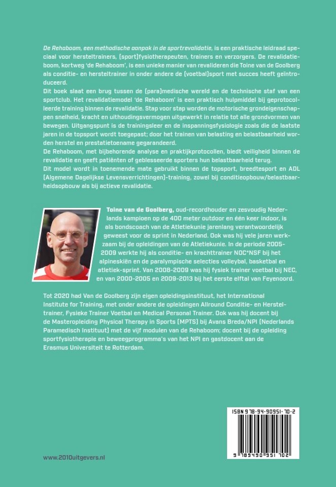 De Rehaboom, een methodische aanpak in de sportrevalidatie, is een praktische leidraad speciaal voor hersteltrainers, (sport)fysiotherapeuten, trainers en verzorgers. De revalidatieboom, kortweg ‘de Rehaboom’, is een unieke manier van revalideren die Toine van de Goolberg als conditie- en hersteltrainer in onder andere de (voetbal)sport met succes heeft geïntroduceerd.