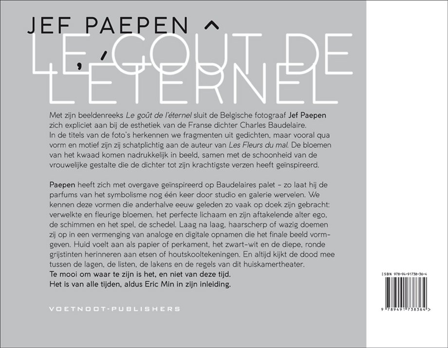 'De bloemen van het kwaad komen nadrukkelijk in beeld,' schrijft auteur en filosoof ERIC MIN in zijn inleiding. Hij vervolgt: 'Paepen laat de parfums van het symbolisme nog één keer door studio en galerie wervelen. Laag na laag, haarscherp of wazig, doemen verwelkte en fleurige bloemen, het perfecte [naakte] lichaam en zijn aftakelende alter ego, de schimmen en de schedel op in een vermenging van analoge en digitale opnamen die het finale beeld vormgeven. Huid voelt aan als papier of perkament, het zwart-wit en de diepe, ronde grijstonen herinneren aan etsen of houtskooltekeningen. En altijd kijkt de dood mee tussen de lagen, de listen, de lakens en de regels van dit huiskamertheater. Te mooi om waar te zijn is het, en niet van deze tijd. Het is van alle tijden.'