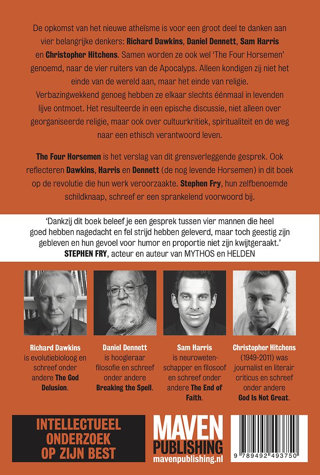 Nu verschijnt deze grensverleggende uitwisseling in boekvorm, aangevuld met nieuwe hoofdstukken die geschreven zijn door Dawkins, Harris en Dennett. Stephen Fry beschrijft in zijn voorwoord hoe het gesprek van 'The Four Horsemen' aan de wieg stond van het nieuwe atheïsme en waarom het effect wereldschokkend was.