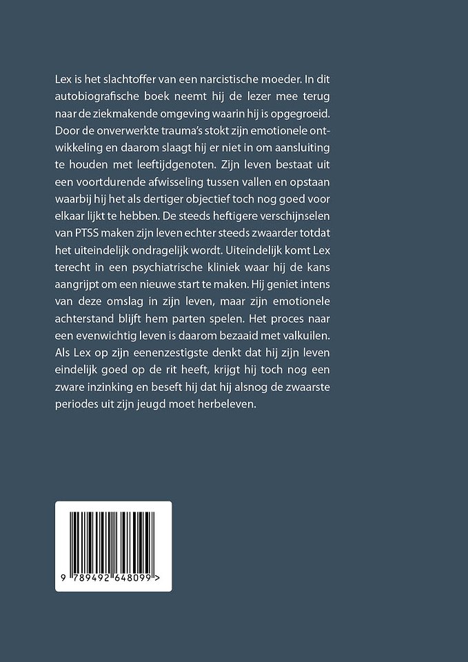 Lex is het slachtoffer van een narcistische moeder. In dit autobiografische boek neemt Lex de lezer mee terug naar de ziekmakende omgeving waarin hij is opgegroeid. Door de onverwerkte trauma’s stokt zijn emotionele ontwikkeling en daarom slaagt hij er niet in om aansluiting te houden met leeftijdgenoten. Zijn leven bestaat uit een voortdurende afwisseling tussen vallen en opstaan, waarbij hij het als dertiger objectief toch nog goed voor elkaar lijkt te hebben.
