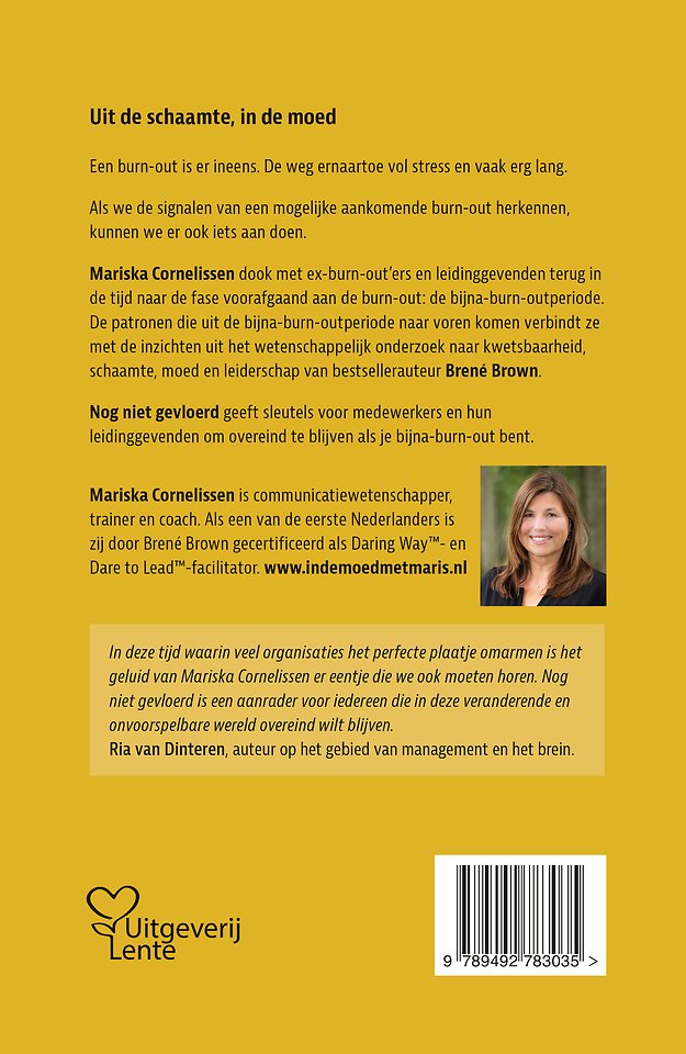 Mariska Cornelissen dook met ex burn-out'ers en leidinggevenden terug in de tijd naar de fase voorafgaand aan de burn-out: de bijna-burn-outperiode. De patronen die uit de bijna-burn-outperiode naar voren komen verbindt ze met de inzichten uit het wetenschappelijk onderzoek naar kwetsbaarheid, moed en leiderschap van bestsellerauteur Brené Brown.