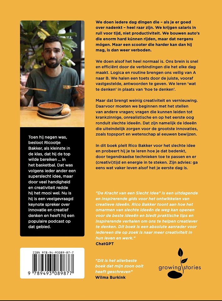 In dit boek pleit Rico Bakker voor het slechte idee en probeert hij je te leren hoe je dat bedenkt, door tegendraadse technieken toe te passen en er (creativi)tijd en energie in te steken. Zijn advies: ga eens wat vaker leven alsof het je eerste dag is.