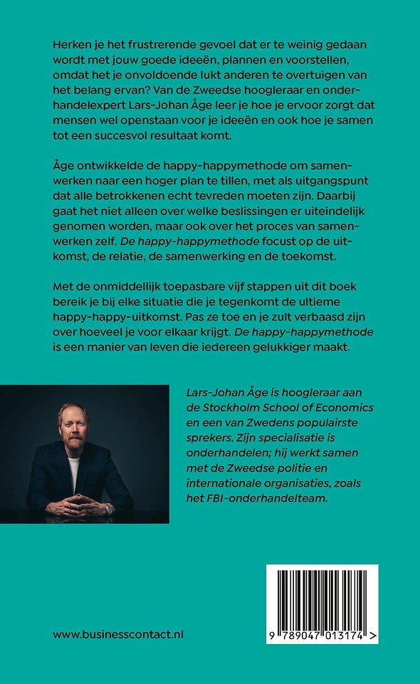 De Zweedse hoogleraar en onderhandelexpert Lars-Johan Åge leert je in ‘De happy happy methode’ hoe je ervoor zorgt dat mensen wel openstaan voor je ideeën en hoe je samen tot een succesvol resultaat komt. Want herken jij dat ook? Dat frustrerende gevoel dat er te weinig gedaan wordt met jouw goede ideeën, plannen voorstellen, omdat het je onvoldoende lukt om anderen te overtuigen van het belang ervan?