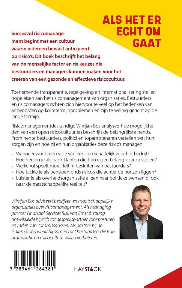 Meer over Wimjan BosSuccesvol risicomanagement begint met een cultuur waarin iedereen bewust anticipeert op risico's. Dit boek beschrijft het belang van de menselijke factor en de keuzes die bestuurders en managers kunnen maken voor het creëren van een gezonde en effectieve risicocultuur.